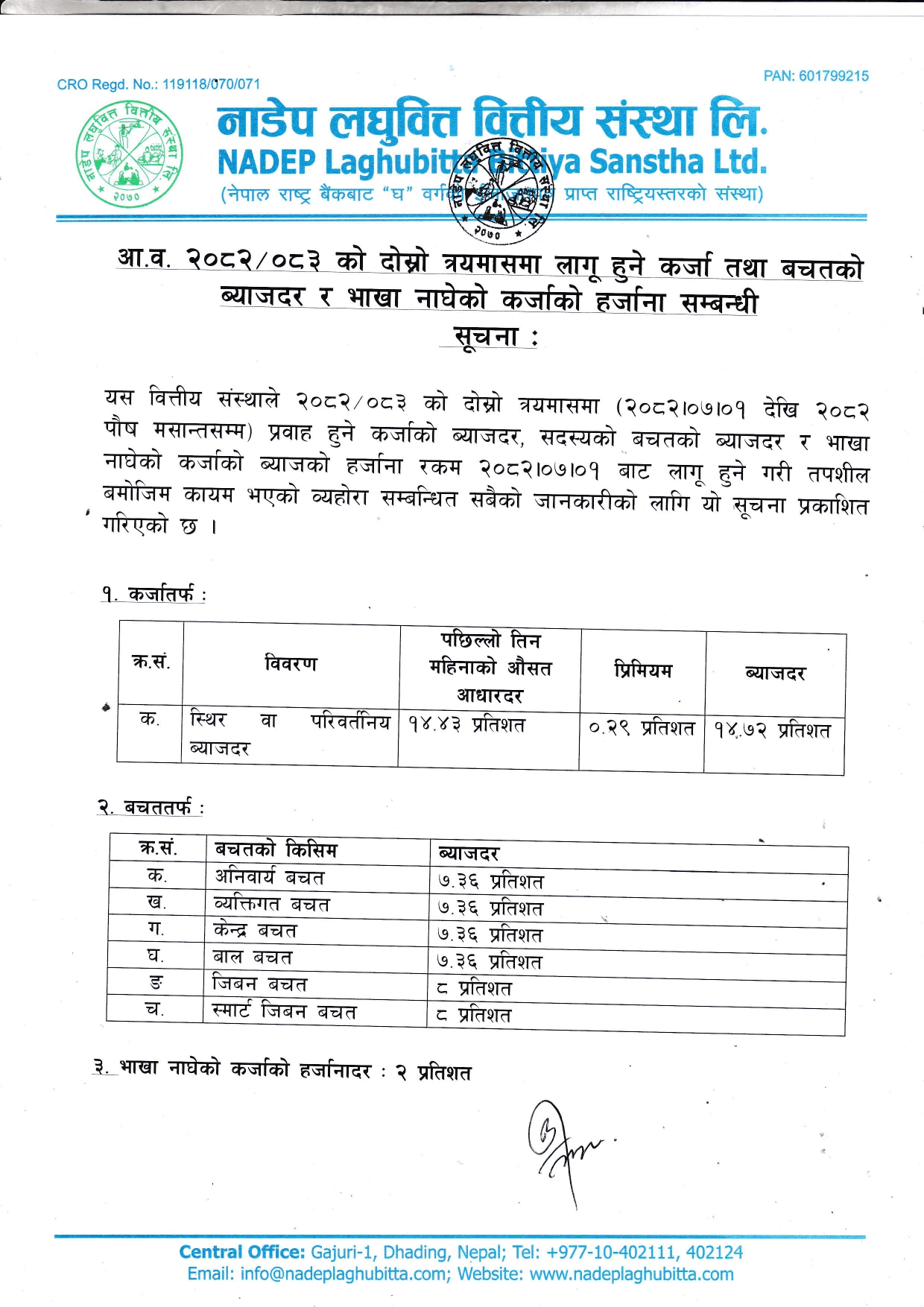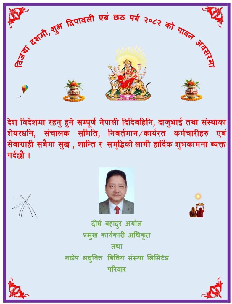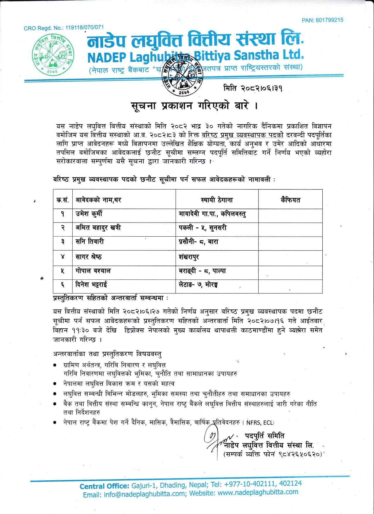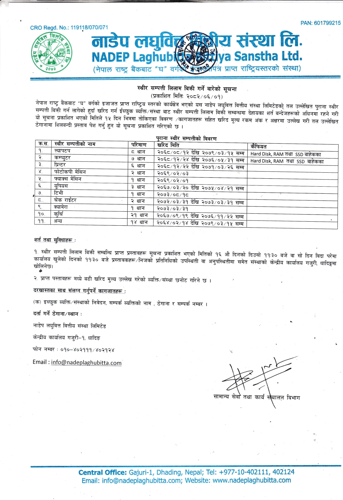 NADEP Laghubitta Bittiya Sanstha Ltd is a micro finance institution licensed as a national level ‘D’ class financial institution from Nepal Rastra Bank the central bank of Nepal. Established as on 29 January 2014 as a public limited company under company act of Nepal and licensed from the central bank of Nepal on 20 April 2015, its head office is in Gajuri 1, Dhading. At Present it has 88 Branches in Jhapa, Morang, Sunsari,Saptari district of eastern Nepal and Bara, Parsa, Rauthat, Sarlahi, Siraha, Mahottari, Dhanusa , Makwanpur, Chitwan, Rasuwa, Dhading , Nuwakot, Kathmandu, Lalitpur, Bhaktapur district of Central region of Nepal. we have opened other branches in Salyan, Rukum, Rolpa,Jajarkot , Dang, Banke, Bardiya districts of mid-western region and Achham, Doti, Dadeldhura, Baitadi, Kanchanpur and Kailai districts of Far-Western region. Furthermore, we are providing services from our new branches from Okhaldhunga, Khotang and Bhojpur districts in eastern region and Kapilvastu, Argakhachi, Palpa, Gulmi, Pyuthan, Rupendehi and Nawalparasi districts of western region.Recently we are providing services from Kaski, Lamjung, Tanahun, Baglung, Parbat and Myagdi districts too in western region.
