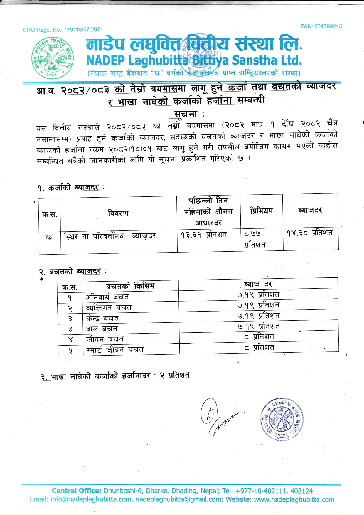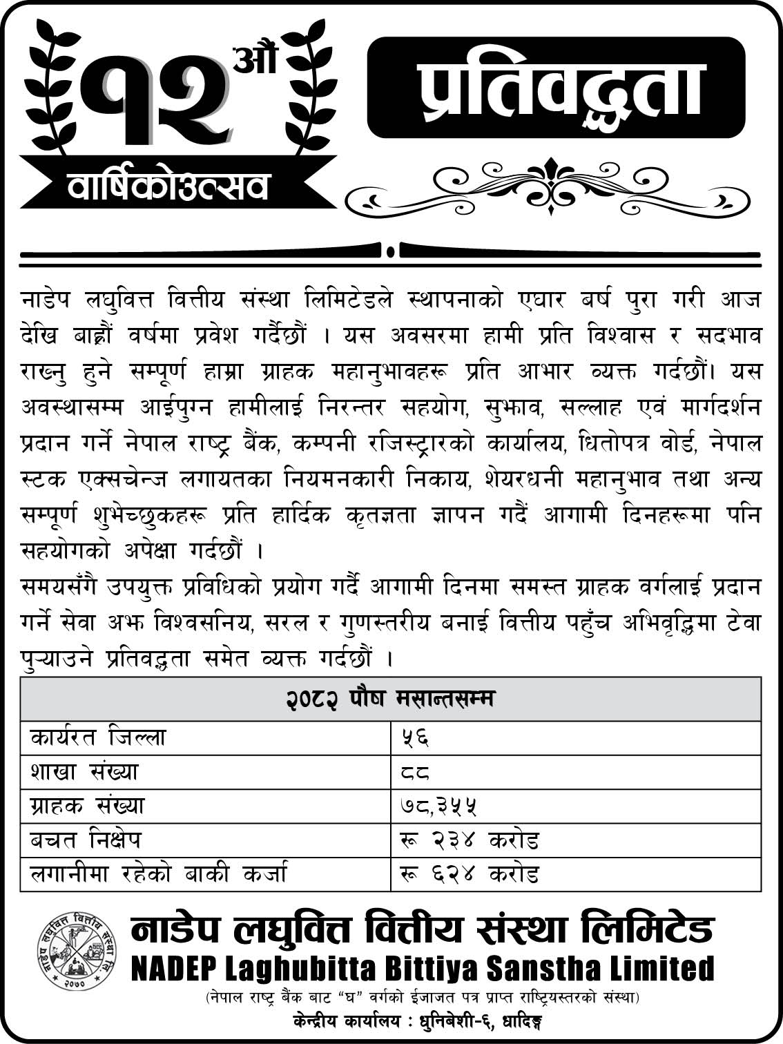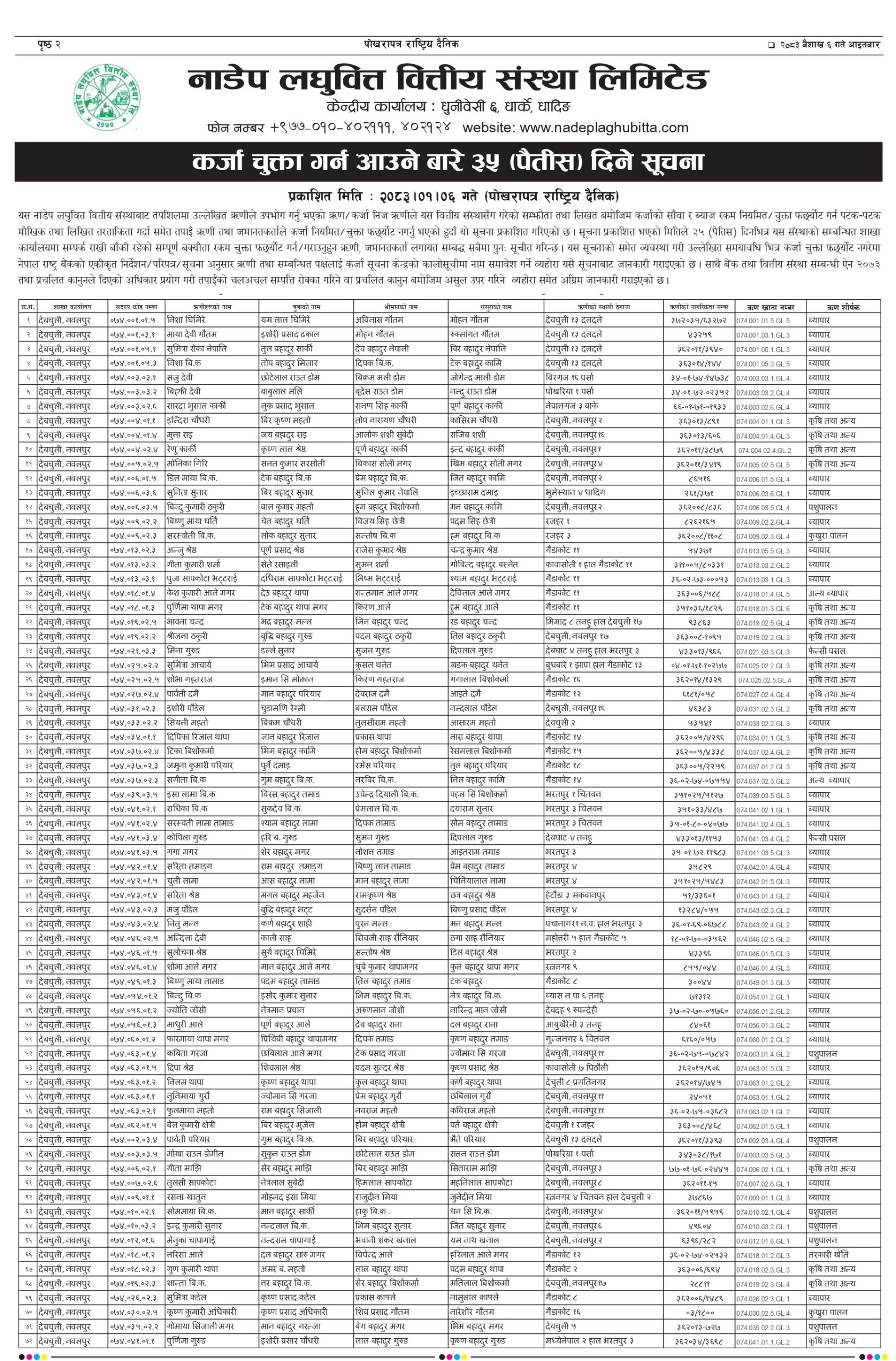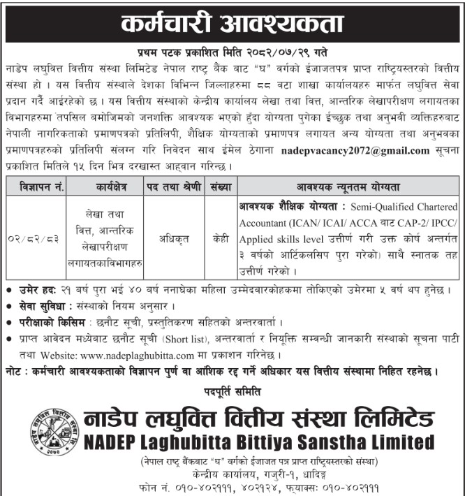 NADEP Laghubitta Bittiya Sanstha Ltd is a micro finance institution licensed as a national level ‘D’ class financial institution from Nepal Rastra Bank the central bank of Nepal. Established as on 29 January 2014 as a public limited company under company act of Nepal and licensed from the central bank of Nepal on 20 April 2015, its head office is in Gajuri 1, Dhading. At Present it has 88 Branches in Jhapa, Morang, Sunsari,Saptari district of eastern Nepal and Bara, Parsa, Rauthat, Sarlahi, Siraha, Mahottari, Dhanusa , Makwanpur, Chitwan, Rasuwa, Dhading , Nuwakot, Kathmandu, Lalitpur, Bhaktapur district of Central region of Nepal. we have opened other branches in Salyan, Rukum, Rolpa,Jajarkot , Dang, Banke, Bardiya districts of mid-western region and Achham, Doti, Dadeldhura, Baitadi, Kanchanpur and Kailai districts of Far-Western region. Furthermore, we are providing services from our new branches from Okhaldhunga, Khotang and Bhojpur districts in eastern region and Kapilvastu, Argakhachi, Palpa, Gulmi, Pyuthan, Rupendehi and Nawalparasi districts of western region.Recently we are providing services from Kaski, Lamjung, Tanahun, Baglung, Parbat and Myagdi districts too in western region.